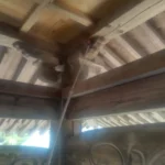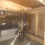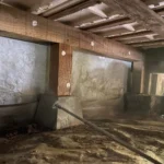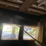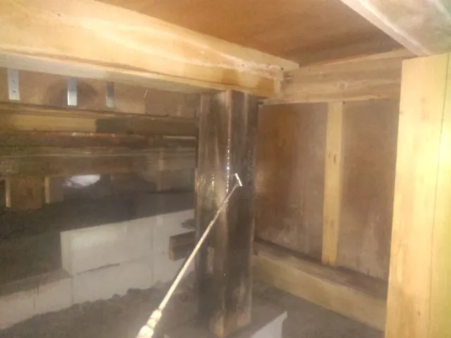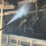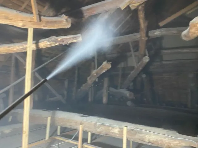 古いシロアリの痕はあったが新しい被害は見られなかった。床下全体にホウ酸水溶液処理。小屋裏にムシ対策のためダスティング処理。